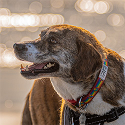 The brains of the operation; always scheming, always plotting. A genuine sweetheart with a stubborn streak and the most will-piercing whimper for treats and toys. She craves attention from her human, and loves the concept of meeting others until she remembers she’s too shy to carry through with introductions. More likely to be found setting up a fortress of solitude under a bench or behind a rock than running around with new friends at the dog park.