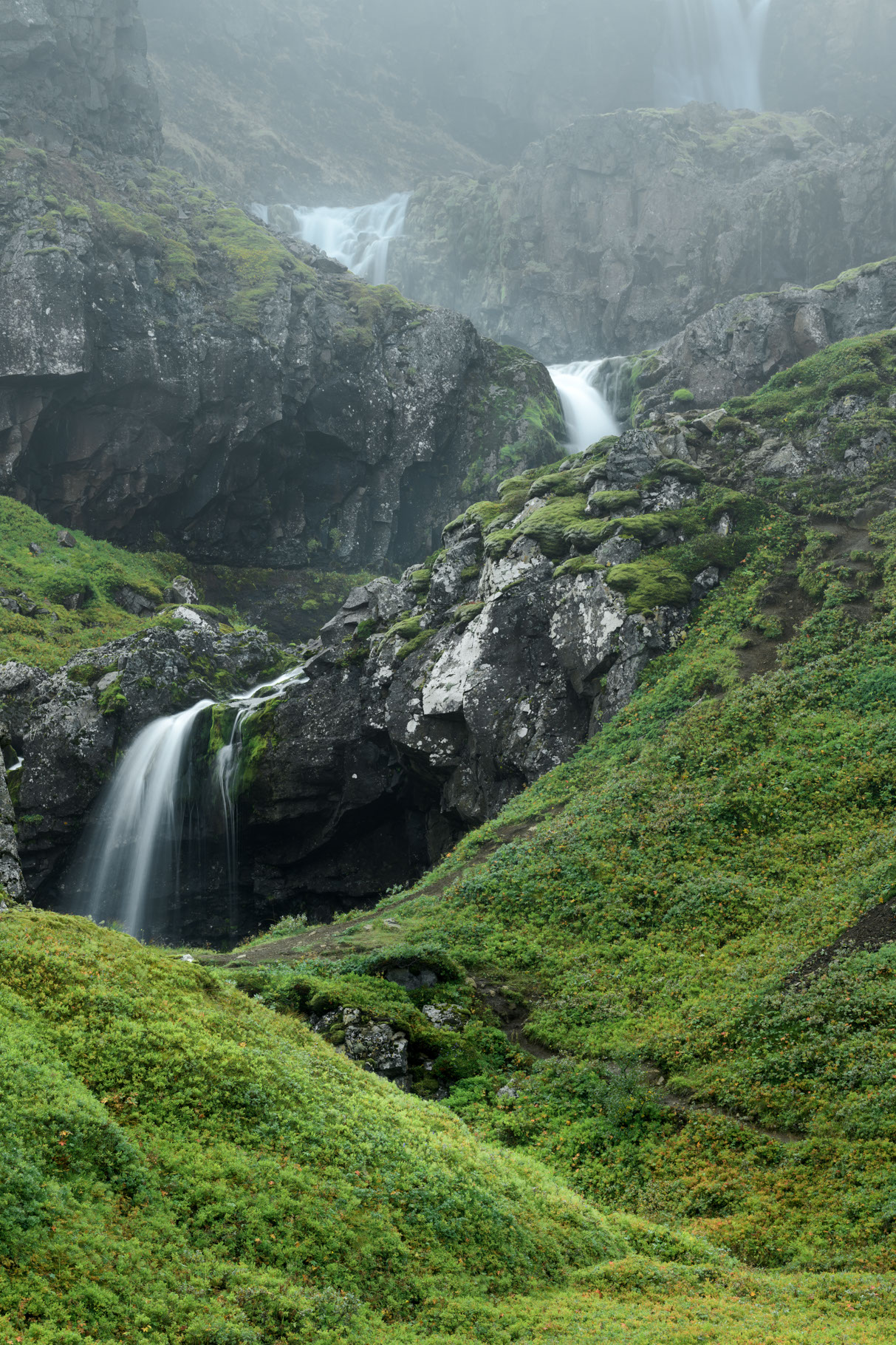 From the mossy field below, the waterfalls peeking over the ledges of the broken cliffs ahead tempt a closer look. As the morning fog reluctantly lifts and makes a relaxing hike tenable, a fine mist from the rushing water chases it upward promising to make quick work of any dry socks worn hither. Narrow foot paths wind up the slopes, suggesting I’m not the first to be drawn inward.